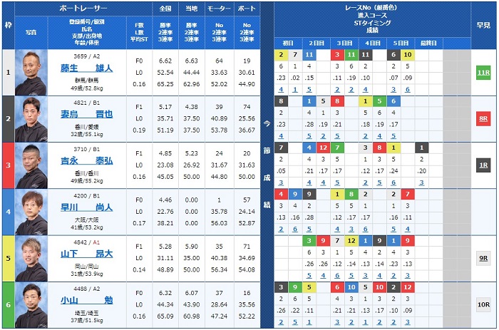 1号艇~5号艇まで勝率6点ほどの選手が並ぶ混戦模様のレースですね。