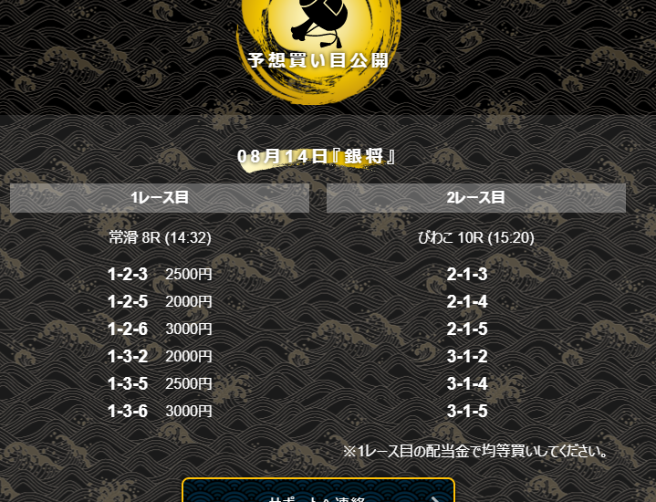 初回限定の「初陣の刻」で「舟王」の宣言通り見事に軍資金稼ぎに成功したので、この資金を使って「舟王」の鉄板予想の「銀将」に参加してみることにしました。