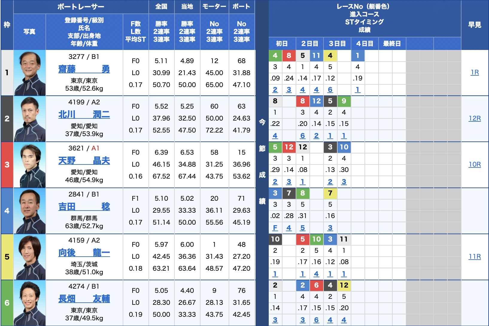 出走表を見ると1号艇はA1級君島秀三選手でスキルが高い選手がスタートしますが、モーター性能はイマイチ。