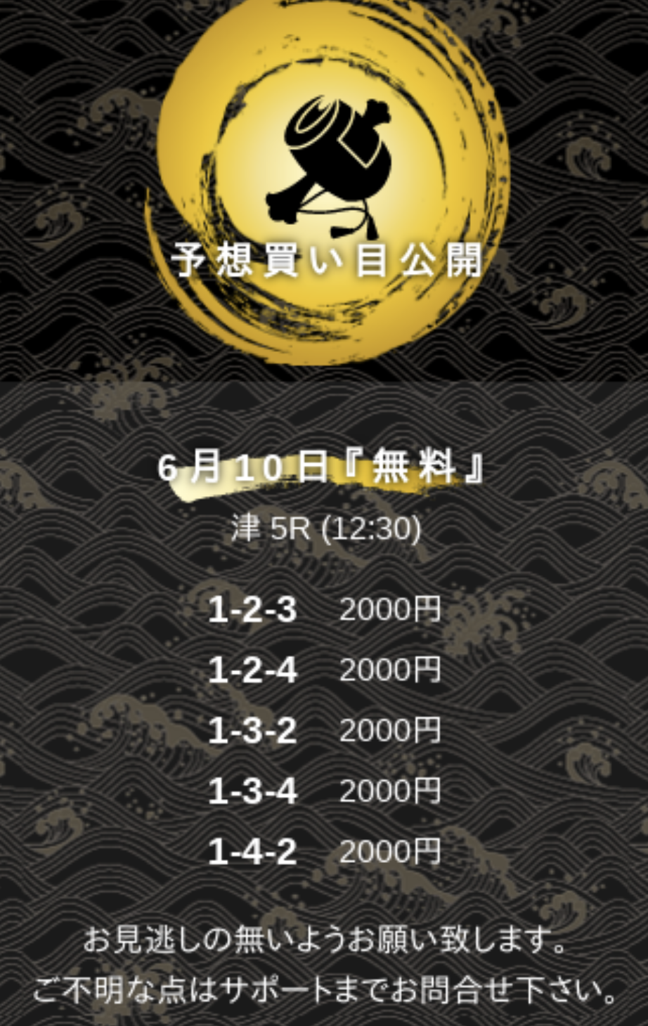 情報料が15万円と、とても高額なので少しためらってしまいましたが、ここまでの有料予想が全て的中していること、稼がせてもらっていることも考慮して、ここは思い切って挑戦することにしました。