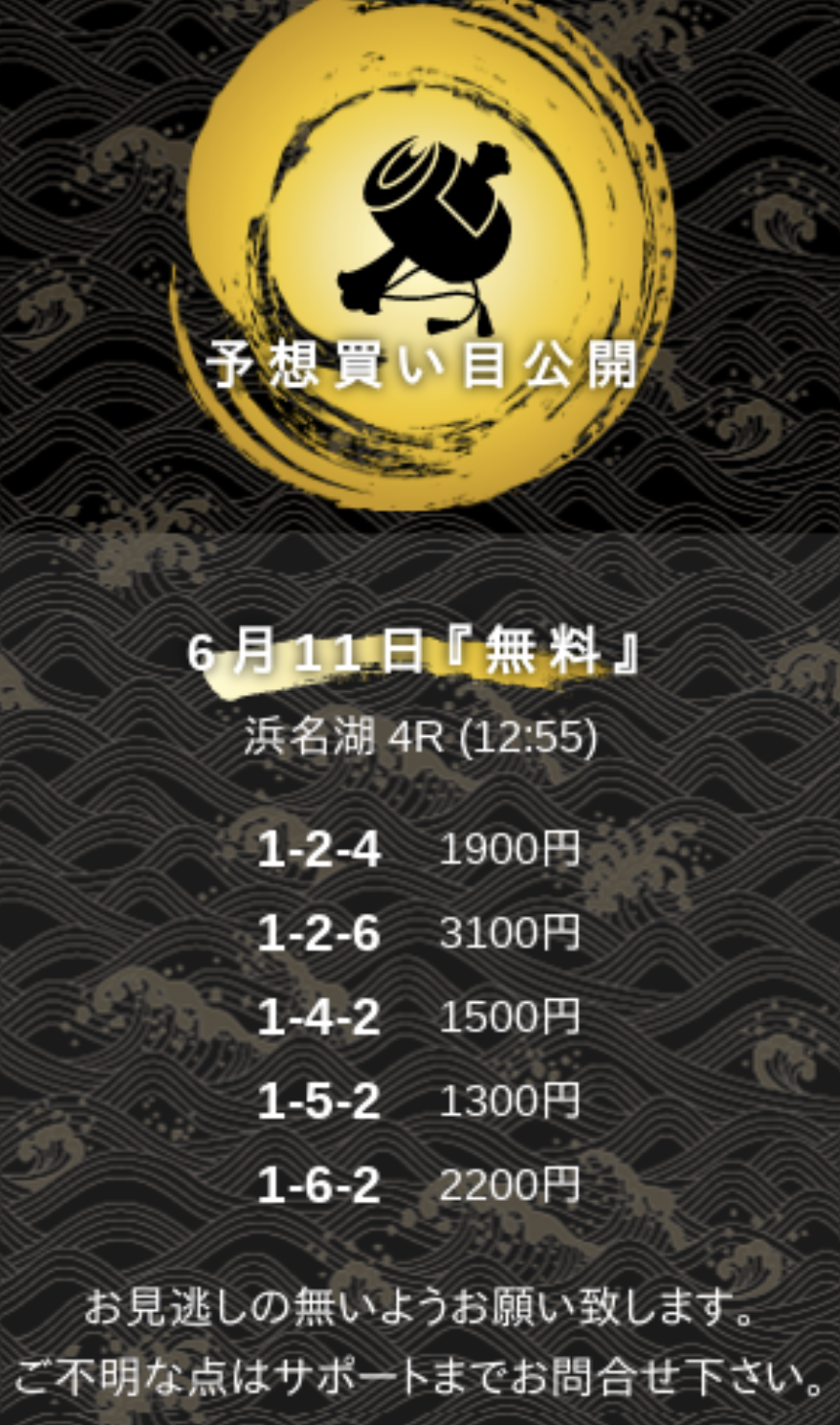 無料予想は、毎日参加しても回収率100%を超えていて「稼げる」ことができ、毎日提供された予想をそのまま購入しても稼ぐことができますが、「平和島・津・児島・芦屋・浜名湖・常滑」の予想が多く、的中率も高いためこの6つの会場の予想が提供されたら参加してみるともっと大きく稼げるのではないかと思います。