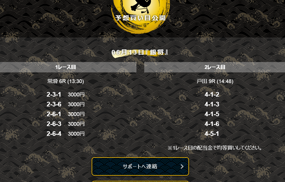 6月13日「銀将」の提供予想は、常滑6R→戸田9Rの2レースコロガシとなっており、提供された買い目は画像の通りとなっています。