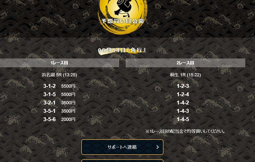6月14日「角行」の提供予想は、浜名湖5R→桐生1Rの2レースコロガシとなっており、提供された買い目は画像の通りとなっています。