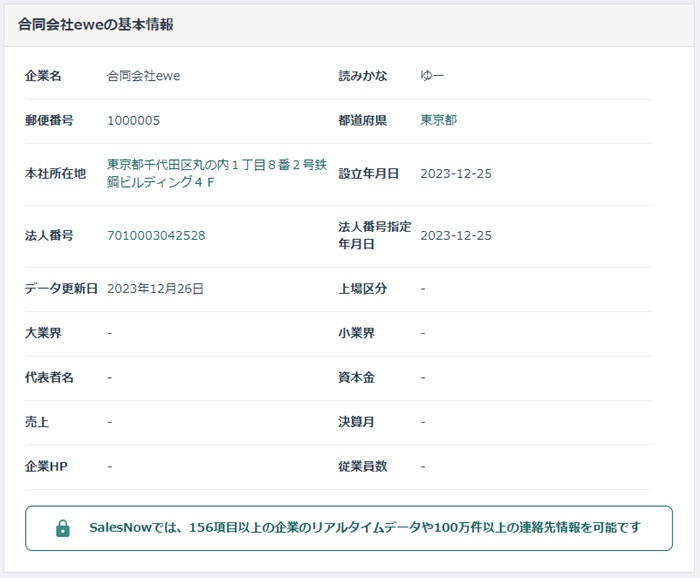 運営会社は「合同会社ewe」、実際に検索してみると、同じ住所の合同会社がヒットしました。