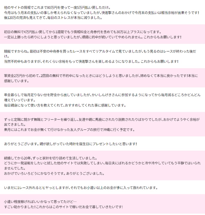 こんなサイト、口コミや無料予想がよくてもあまり使う気にはなりませんが、検証ということでまずは、各批評サイトに寄せられた競艇快進撃に関する口コミを見てみましょう!