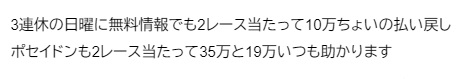 無料予想が当たって、その後ポセイドンという有料予想を購入したと思われる口コミもありました。