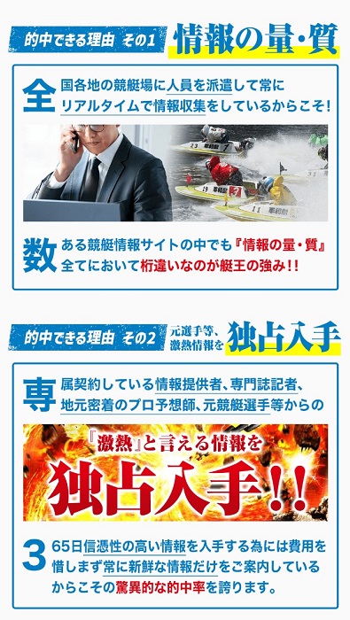 「全国各地の競艇場に人員を派遣」や「元競艇関係者からの情報」など、よくみる内容ですね。
