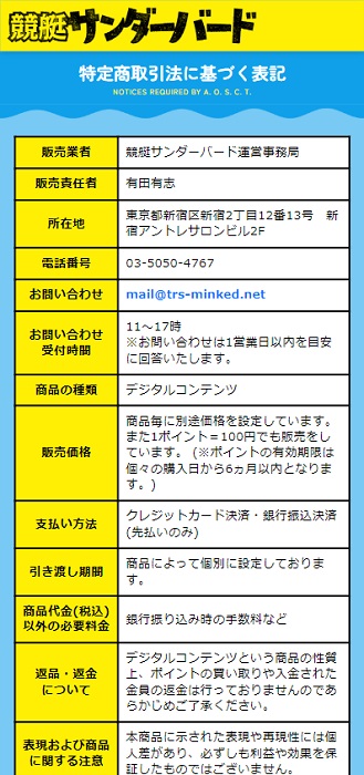 - 【販売業者】競艇サンダーバード運営事務局