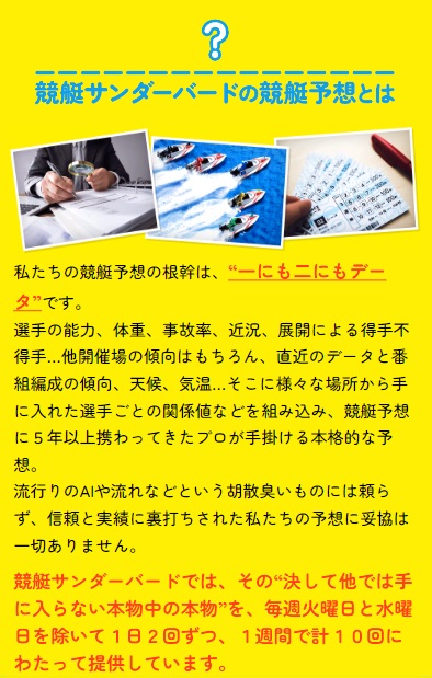 競艇サンダーバードの予想の根幹は、「一にも二にもデータ」だそうです!