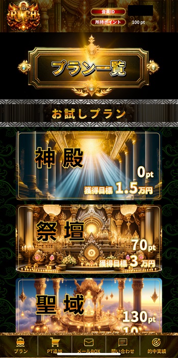 | プラン名 | 目標金額 | 推定投資金額 | 予想内容 | 予想数 | 必要pt |