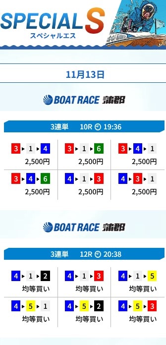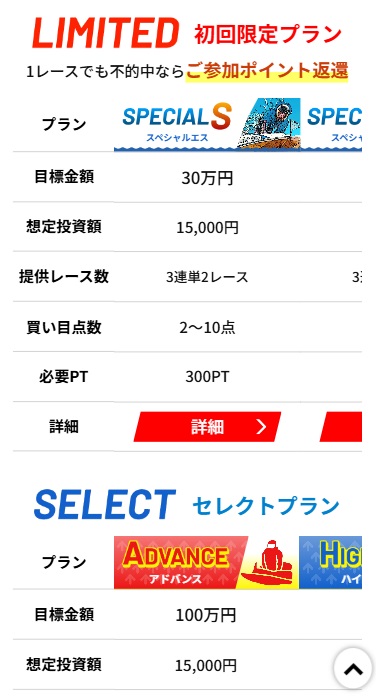 | スペシャルS | 35万円 | 15,000円 | 3連単2~10点 | 2レース | 300pt | 初回限定プラン |