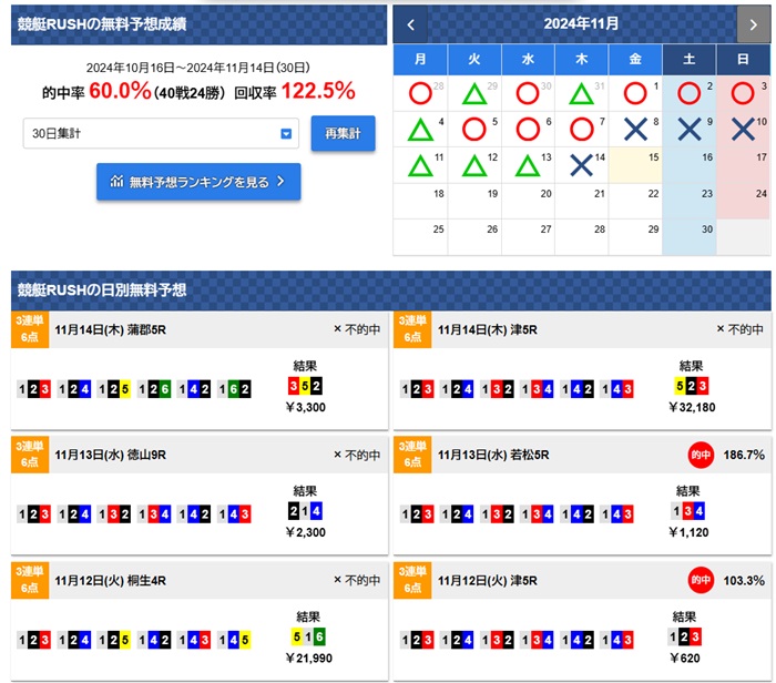 競艇ラッシュの無料予想の特徴は以下の通り。