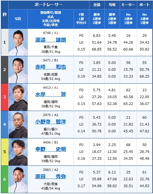 1号艇はA1・渡邉雄朗、勝率は出走メンバーのなかで最も高いものの、節間の調子はあまり良さそうではありません。