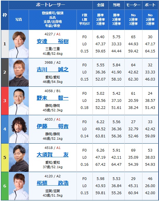 このレースは1号艇から6号艇まで勝率5点以上の選手が揃う混戦となっています。