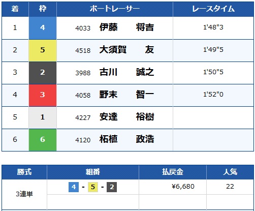 展開を突いた5号艇・大須賀友と安達裕樹が1着争いで万事休すかと思われましたが、2マークでやりあっているところを伊藤将吉が展開を突き1着!