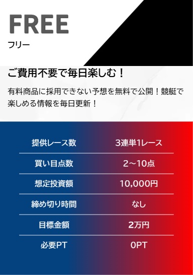 | シングル | 7万円以上 | 10,000円 | 3連単2~10点 | 2レース | 150pt | お試し |