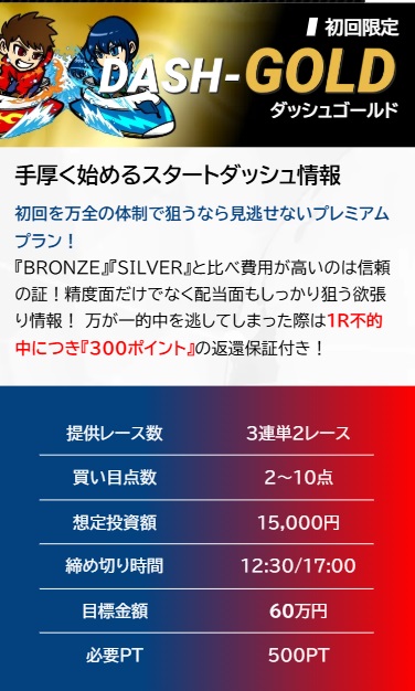 | ダッシュゴールド | 60万円 | 15,000円 | 3連単2~10点 | 2レース | 500pt | 初回限定プラン |