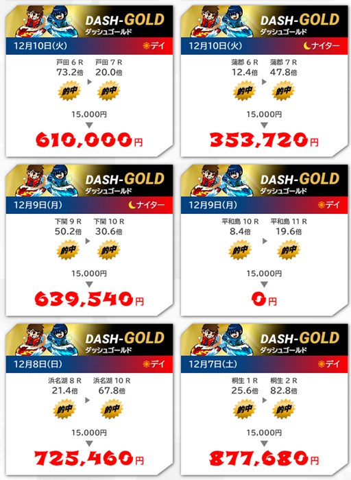 今回購入した競艇スマッシュの初回限定プラン「ダッシュゴールド」の結果は以下の通りです!