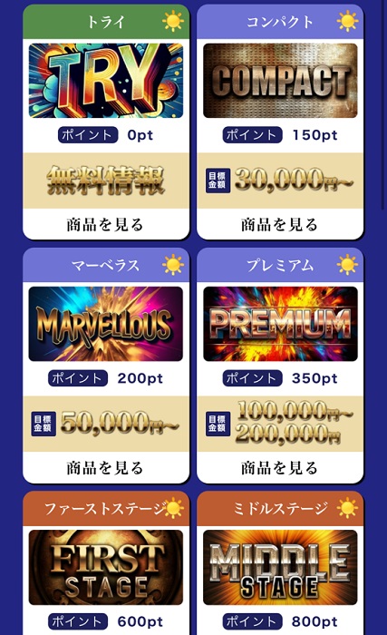 | グランドステージ | 40~60万円 | 1点2,000~2,500円 | 5~8点 | コロガシ2レース | 800pt |