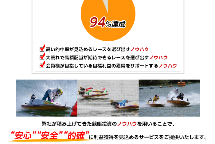 これらのノウハウ通りに競艇投資を進めて目標を達成した会員は、なんと94%とのこと。