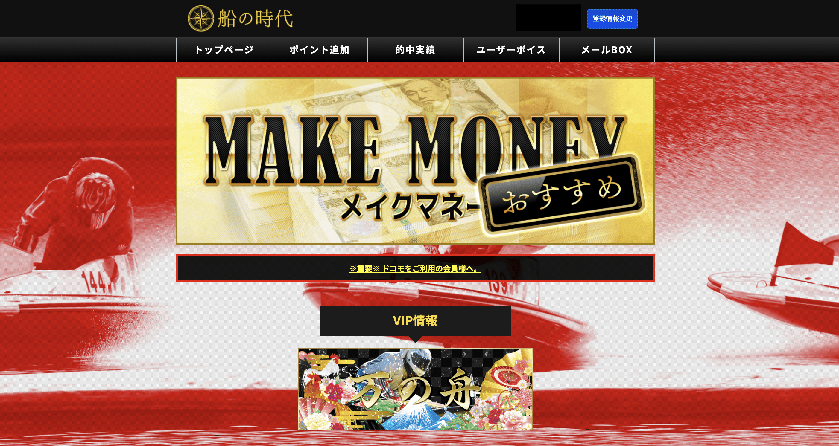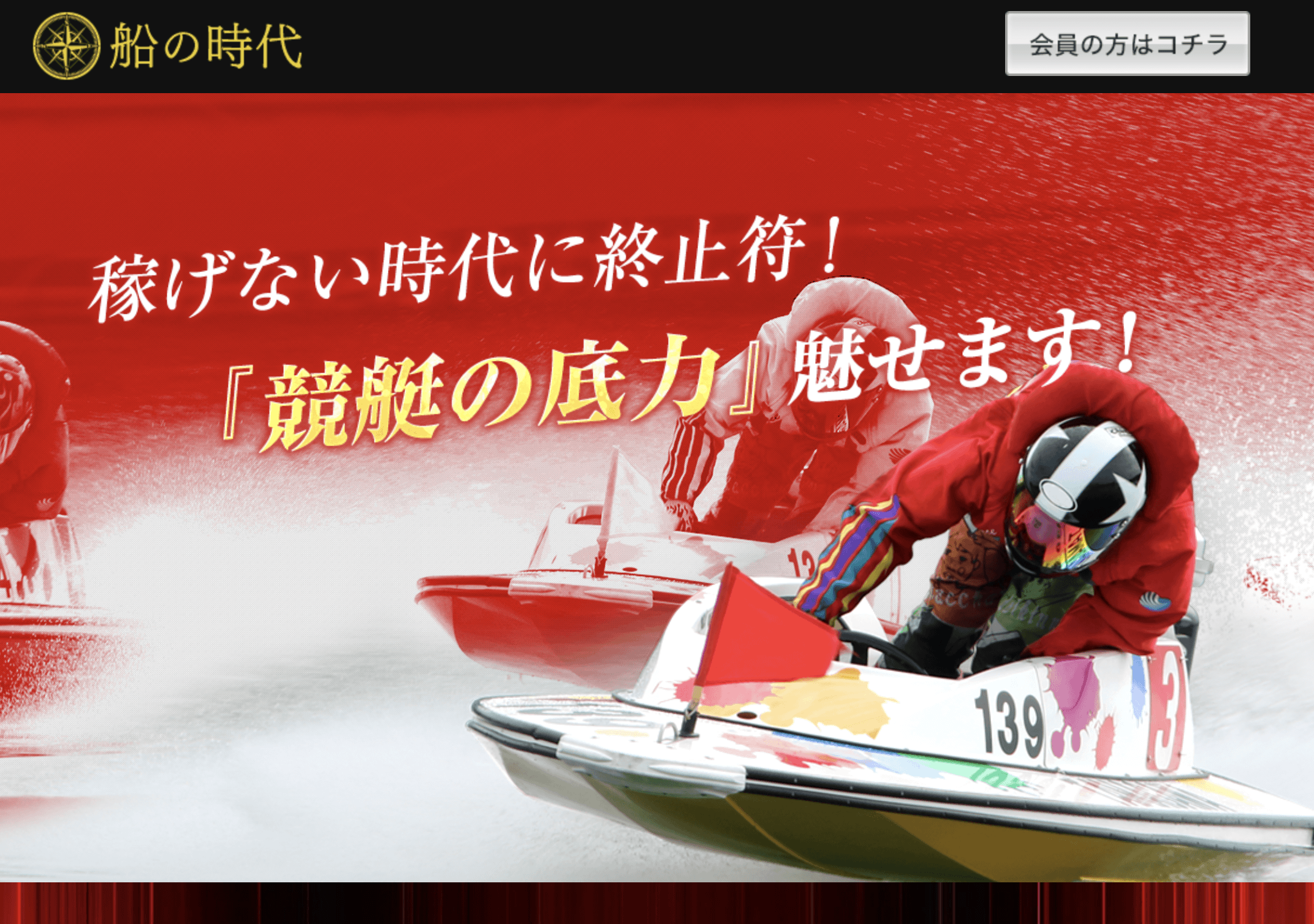 「船の時代」にアクセスすると、トップには「稼げない時代に終止符!『競艇の底力』見せます!」という煽り文句とともにの背景に競艇選手が大きく載っています。