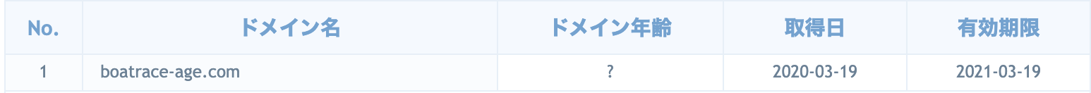 現在「船の時代」で使われているドメインは、「boatrace-age.com」となっており、このドメインを取得したのが2020年3月19日となっているため、以前使っていたドメインから変更して新しく取得したようですね。