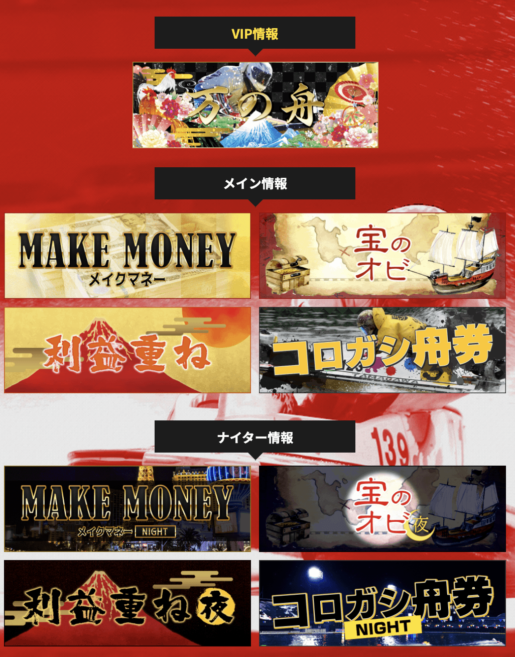 「船の時代」の有料予想は、メイン情報、ナイター情報、特訓情報にそれぞれ分けられており、高配当や的中率重視、オビ狙いなど自分がどうやって稼ぐかに応じてどの有料プランがオススメという説明がしっかりとされているので迷わず目的の予想を購入できるところが親切で分かりやすいですね。