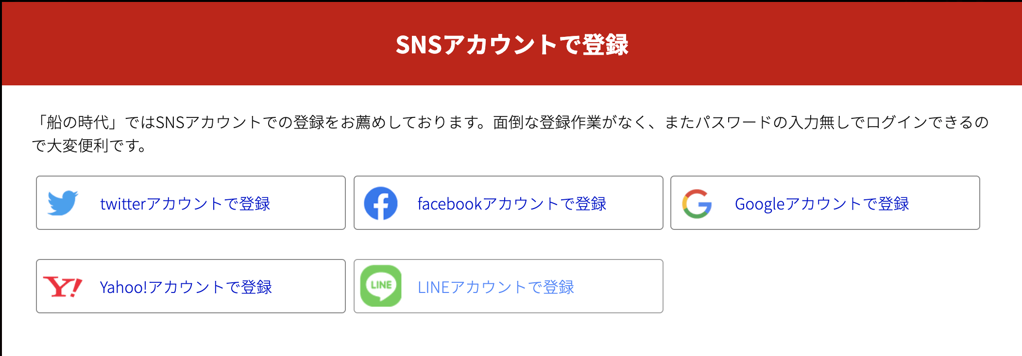 「船の時代」の会員登録は、他の競艇予想サイトとひと味違って各SNSでも登録できるようになっており、SNS登録に対応しているサービスは5つ(Twitter・Facebook・Google・yahoo!JAPAN・LINE)となっています。