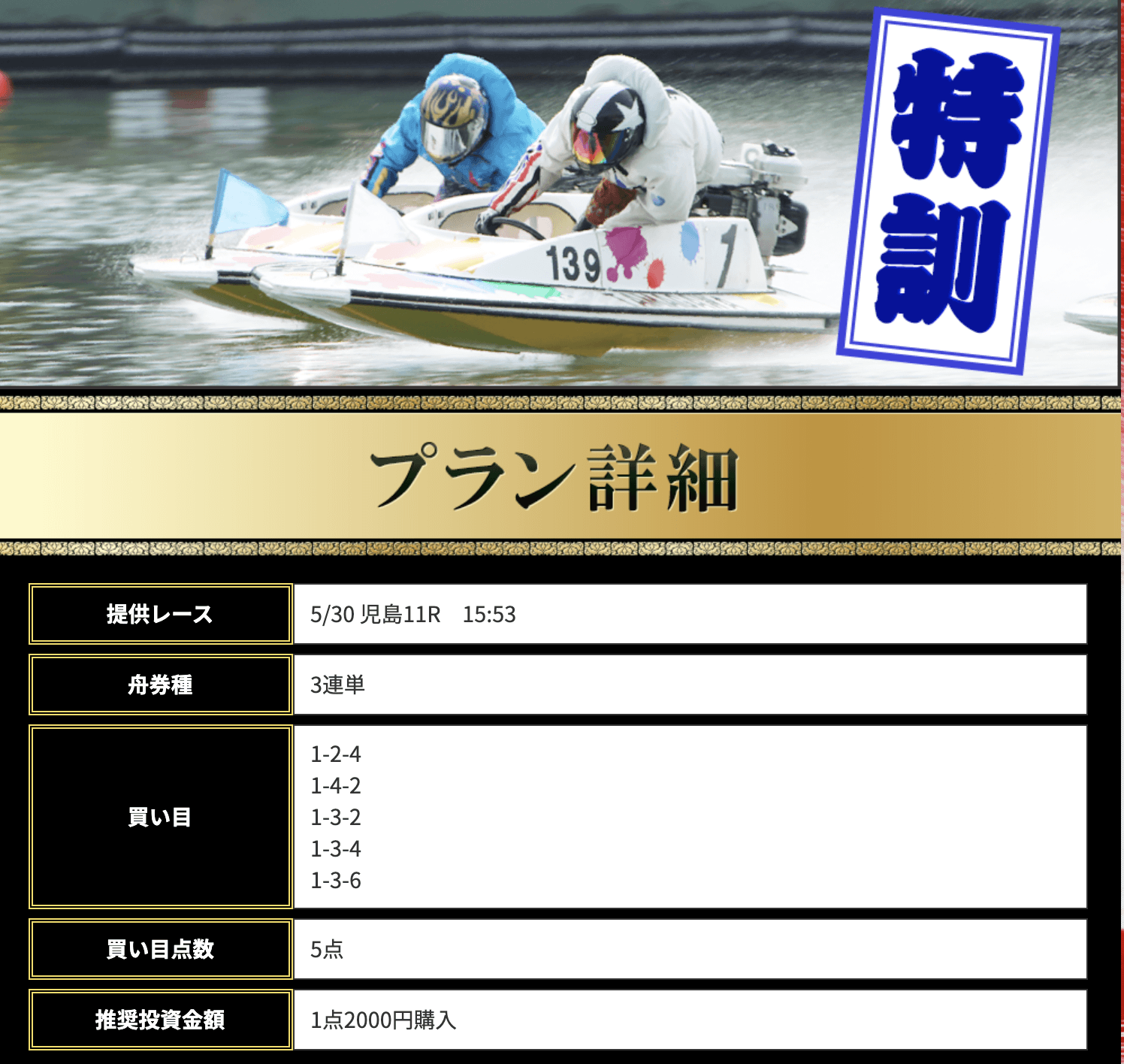 | 特訓 | 60PT | 1レース | 5点(1点2,000円) | 5万円 |