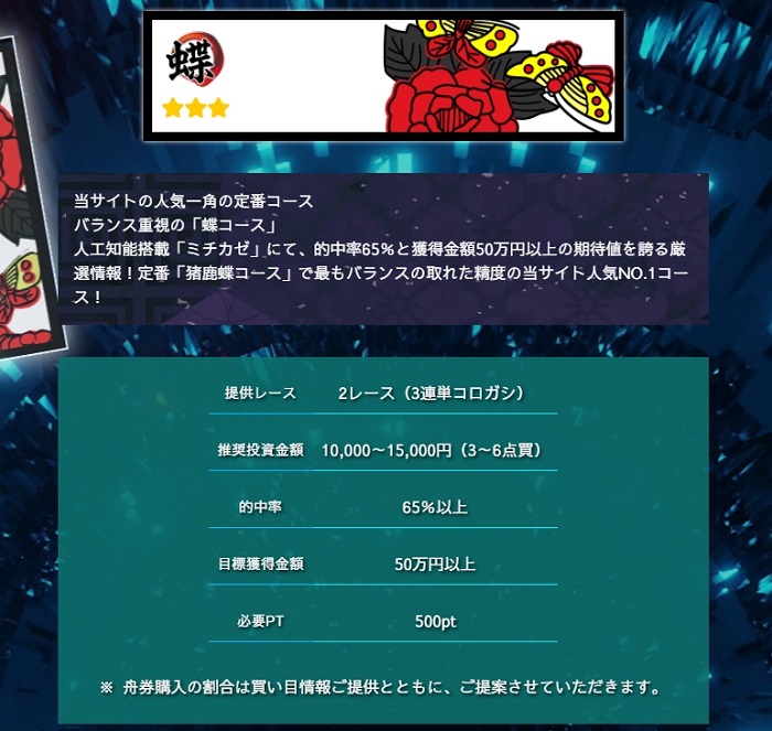 「花舟」では500ptで参加できる「猪」「鹿」「蝶」が人気定番予想として存在し、それぞれに「的中率重視」「高配当重視」「バランス重視」と特徴があることで有名です。