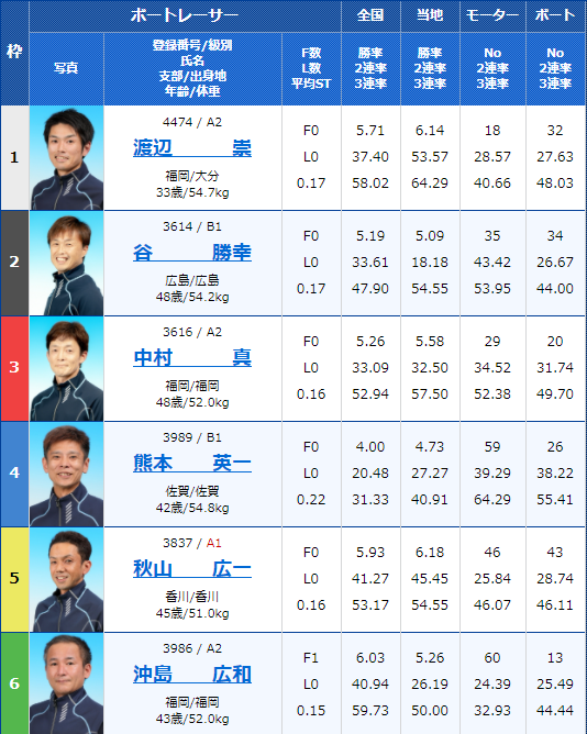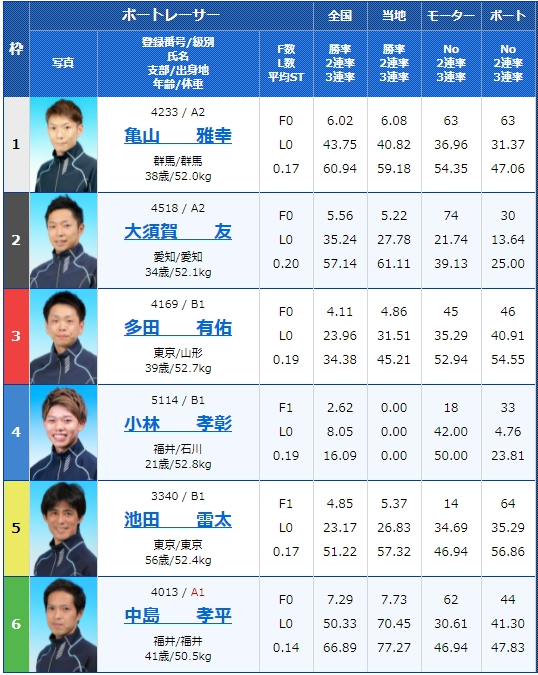 ただ、5号艇の澤大介は勝率も他選手と変わらず、モーターも上々で、ここを排除するのが素人の予想との違いというところでしょうか。