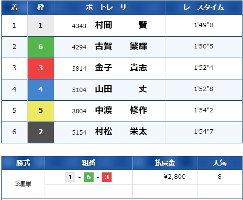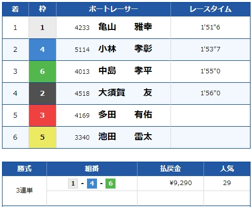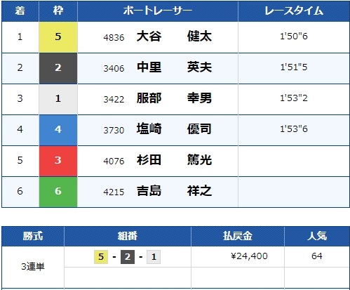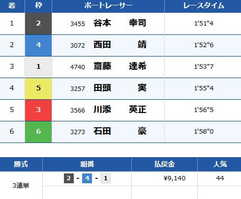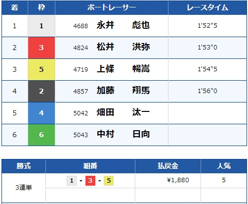 このサイトでは1号艇・2号艇・4号艇で買い目が構成されていましたが、素人目には5号艇の田頭実を排除するのは悪手に見えます。