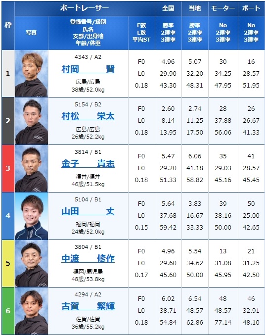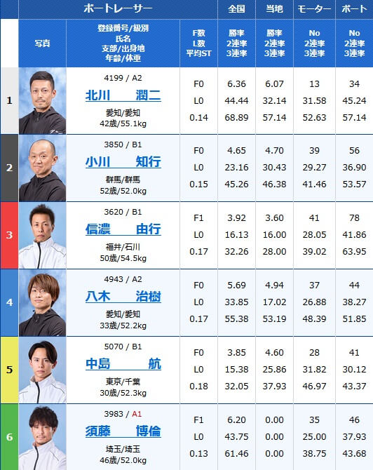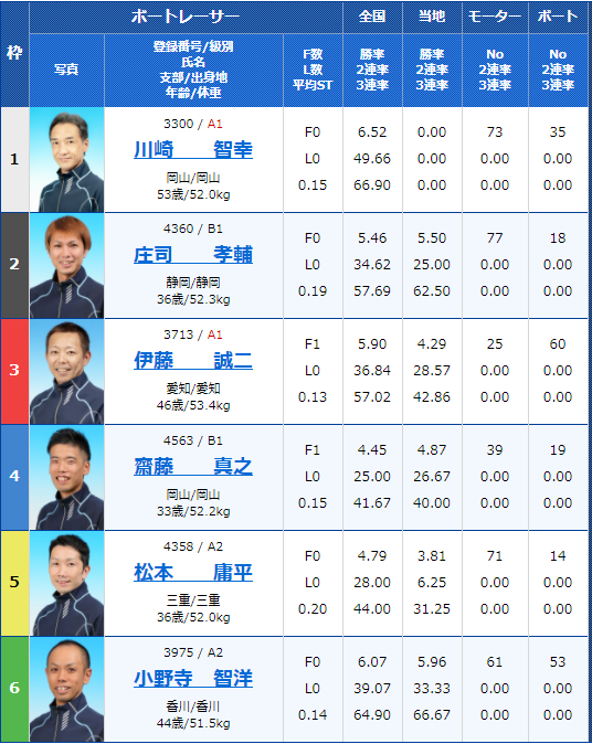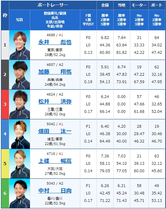 A1級の1号艇の川崎選手を中心に、4号艇の斎藤選手、2号艇の庄司選手、5号艇の松本選手が並ぶような予想となっています。