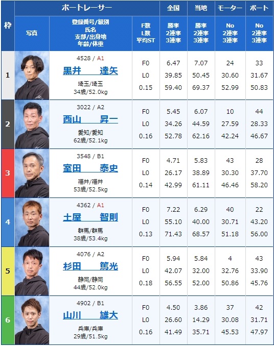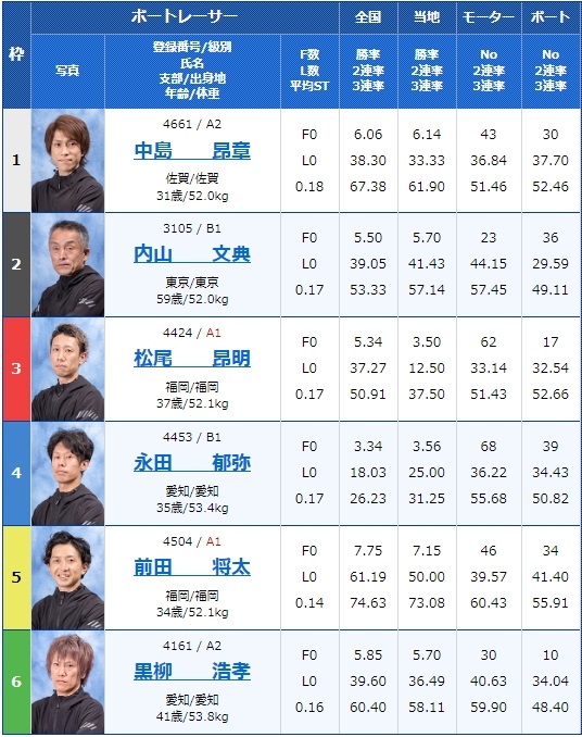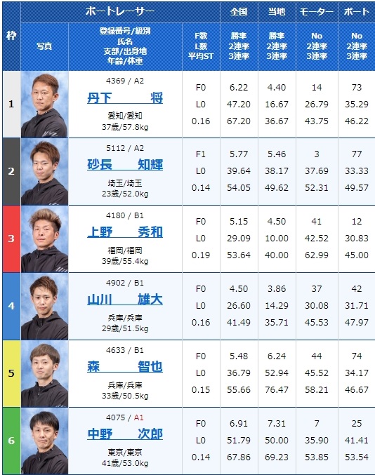 出場選手は全員がA級ということで、素人目には予想が難しくなっていますが、このサイトでは1号艇の篠田優也と4号艇の今垣光太郎を推しています。