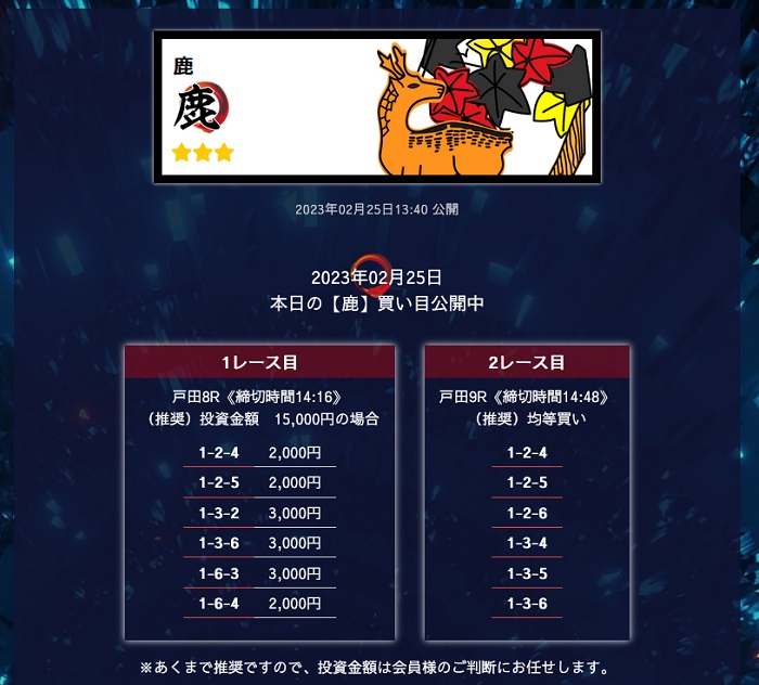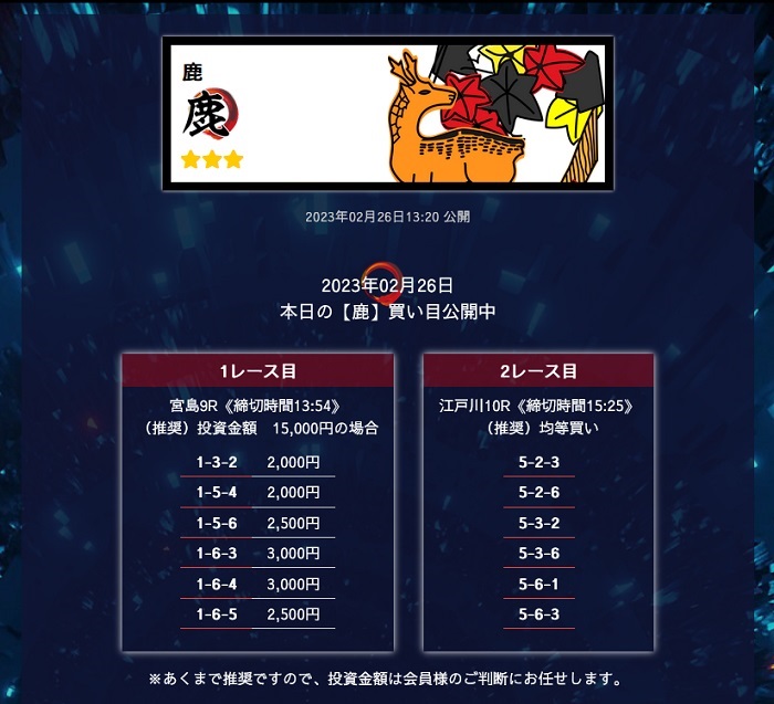 今回はクチコミで人気の高かった高配当重視の「鹿」コースに参加してみましたが、クチコミ通りの実力を確かめることが出来ました。