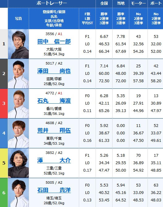 2号艇の澤田尚也は全国勝率が出走選手中トップ、3号艇の石丸海渡はA1級と、きちんと情報を集めて予想をしているみたいですね。