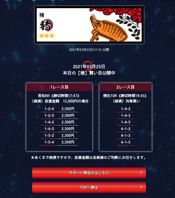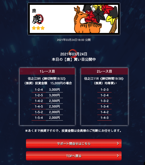 有料予想は、単発の「月札」コース、高配当が狙える「鹿」コースに参加し、結果の方もとても良く、2日間の検証で60万円近く稼ぐことが出来ました。