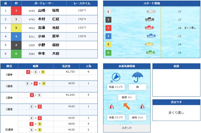 スタートがビシッと揃ったので1号艇木村仁紀が逃げるかと思いきや、ターンが思いっきり流れて3号艇山崎裕司がまくり差し!