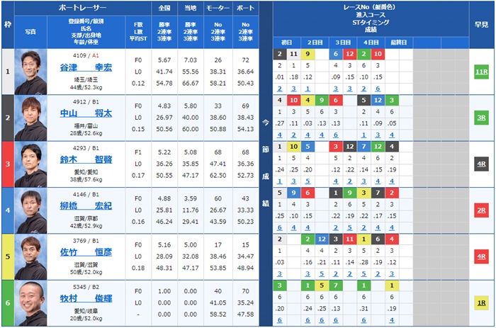 このレースは先ほどとは違い、1号艇のみがA1級の谷津幸宏、逃げが濃厚なレースと言えそうです!