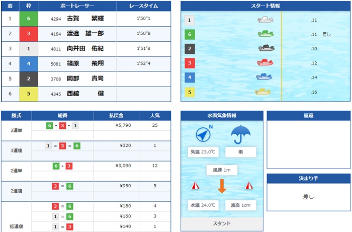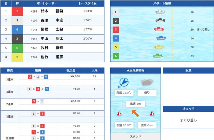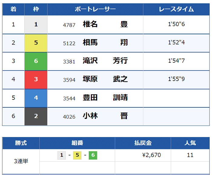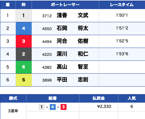 堅めの予想とは言えちょっとドキドキしましたが、4号艇の川原祐明選手がまくりを決めて見事的中となりました。