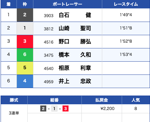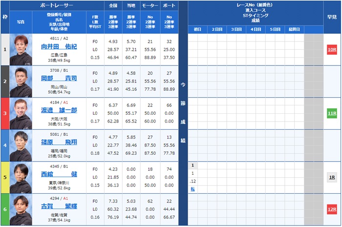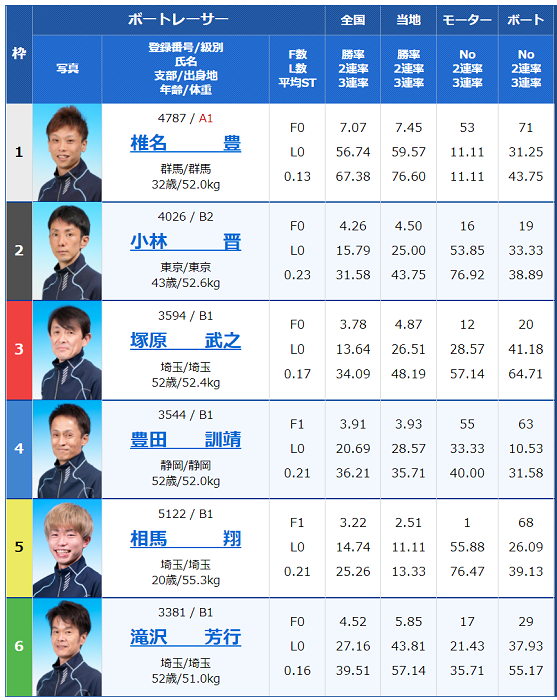 反対に、2,4,6号艇は新人選手など実力で見るとちょっと劣る選手が入っていますね。