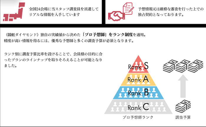 予想師はC〜Sランクの4段階にランク分けされてランク別に調査予算比率が設けられており、予想師達の情報を独自のノウハウでかけ合わせて買い目情報を作り上げているとのことです。