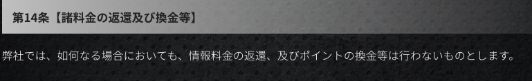 そして利用規約には「如何なる場合においても情報料金の返還、及びポイントの換金等は行わないものとします」と明記されています。