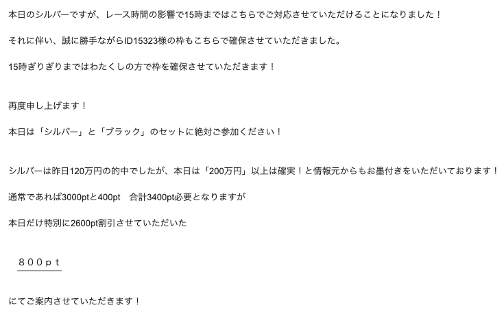 「枠は確保してあります」 「的中期待度は85%以上・・・ID○○様には、利益を手にしていただきたいのです」 「上層部と掛け合って、なんとかこのプランをご用意できました!」 もう勘弁してください。