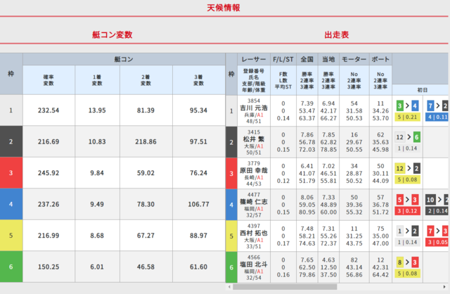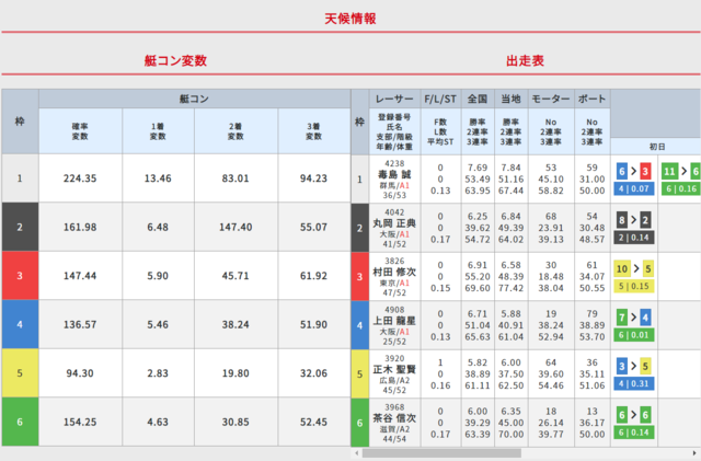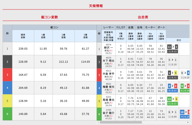 1~4号艇の「確立変数」が高く、「1着変数」が高いのが1・2号艇でした。