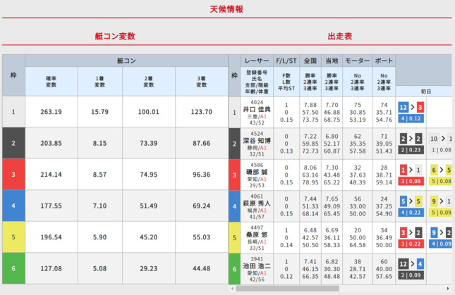 艇コンは、一つの画面上に『レーサー情報』、『モーター・ボートの勝率』、『天候』、『直前情報』が非常に見やすい形で1つの画面にまとまっています。
