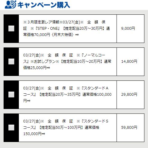 | コース | 人数制限 | 的中率 | 目標金額 | 内容 | 投資額 | プランの価格(割引後) |
