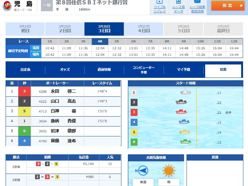 3月26日の児島の4Rで、1号艇を軸に予想されているのが分かるな。