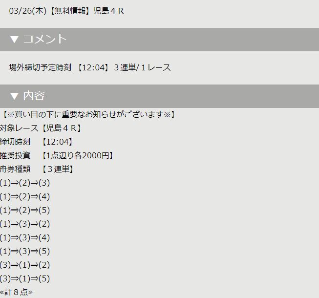 基本的に公開されるのは1日1レースで、買い目は6~8点となっていることが多い。