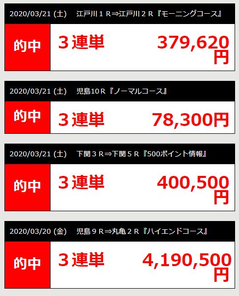 2月28日~3月2日まで連続してほぼすべての有料予想が的中しているのだ。しかも3連単のコロガシが多いのも気になる。